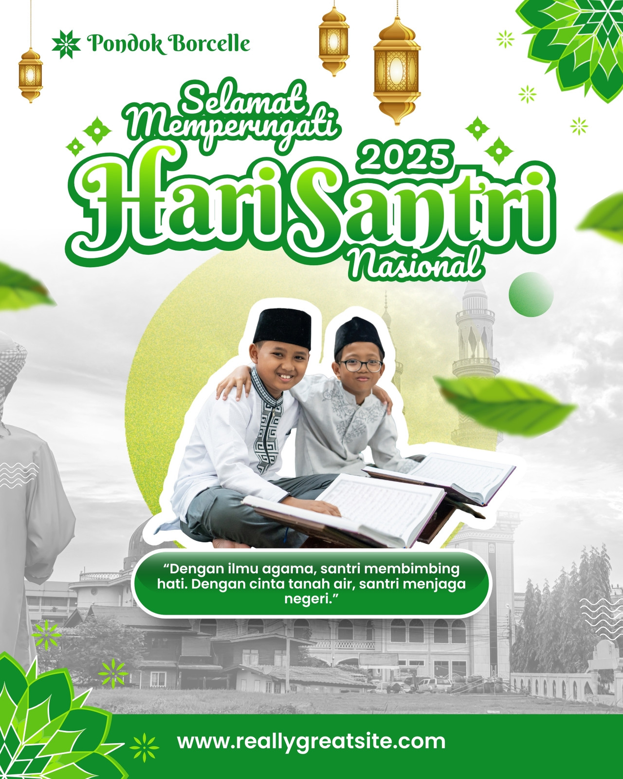 - Tambahkan elemen dekoratif seperti logo Hari Santri, gambar santri, atau simbol nasional.